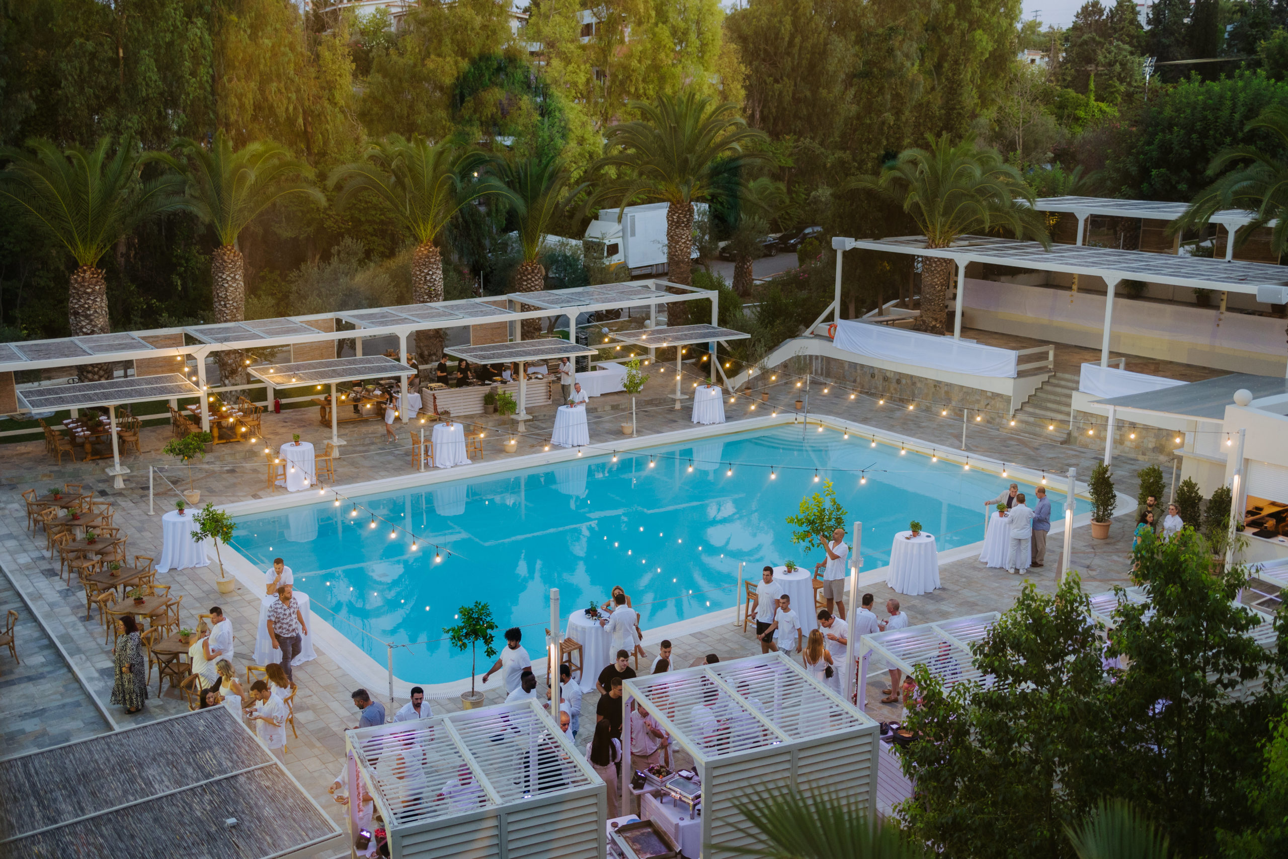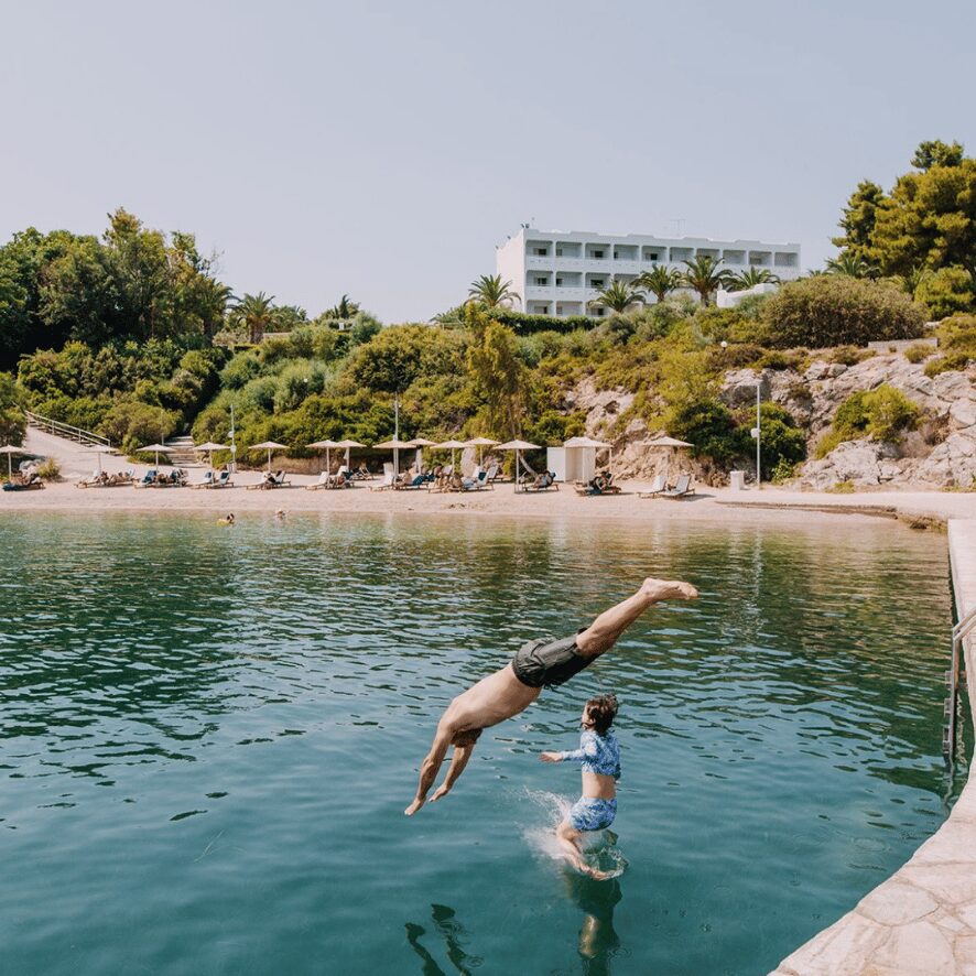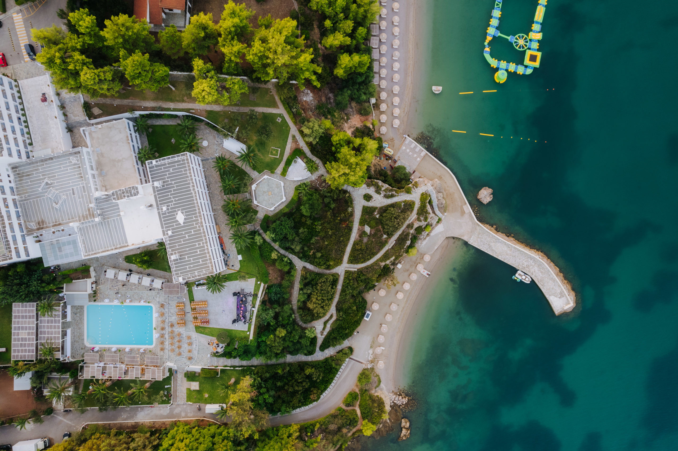 Brown Beach Chalkida sits on the edge of the Evian Gulf, surrounded by pine trees, with views that stretch to the horizon. Whether you’re barefoot in the sand or under the stars by the pool, the setting lends itself beautifully to open-air ceremonies and al fresco dining.